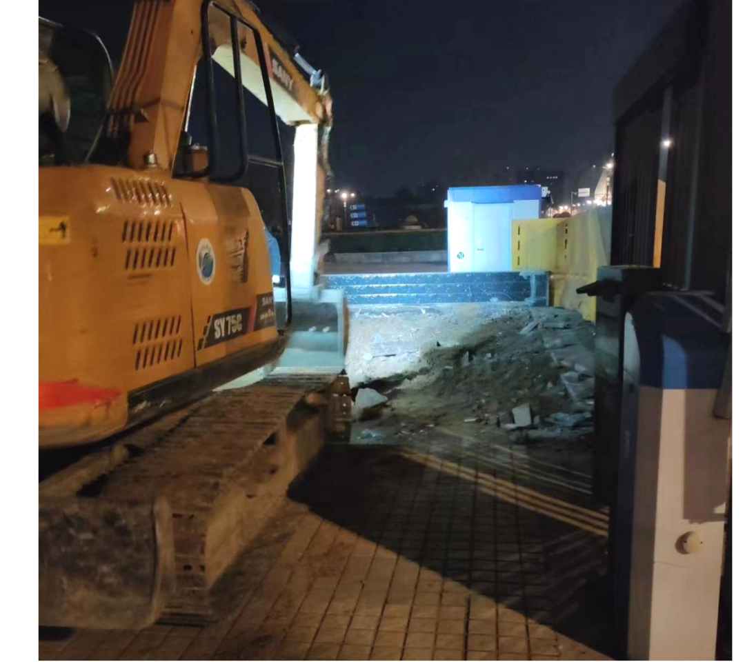 经过紧张有序的施工,26日晚9时,现场完成施工区域GPS定位;晚10时,完成所有施工区域边界线划线;27日凌晨4时,完成施工区域路面破碎;早上6时,完成所有破碎物料清运;6时30分,完成现场区域卫生清扫收尾,机械撤场,破碎物料全部清运至杨正门建筑垃圾应急处置场。历时12小时,农业银行拆墙透绿项目路面破碎及清运工作圆满完成,28日连夜完成施工围挡加装。